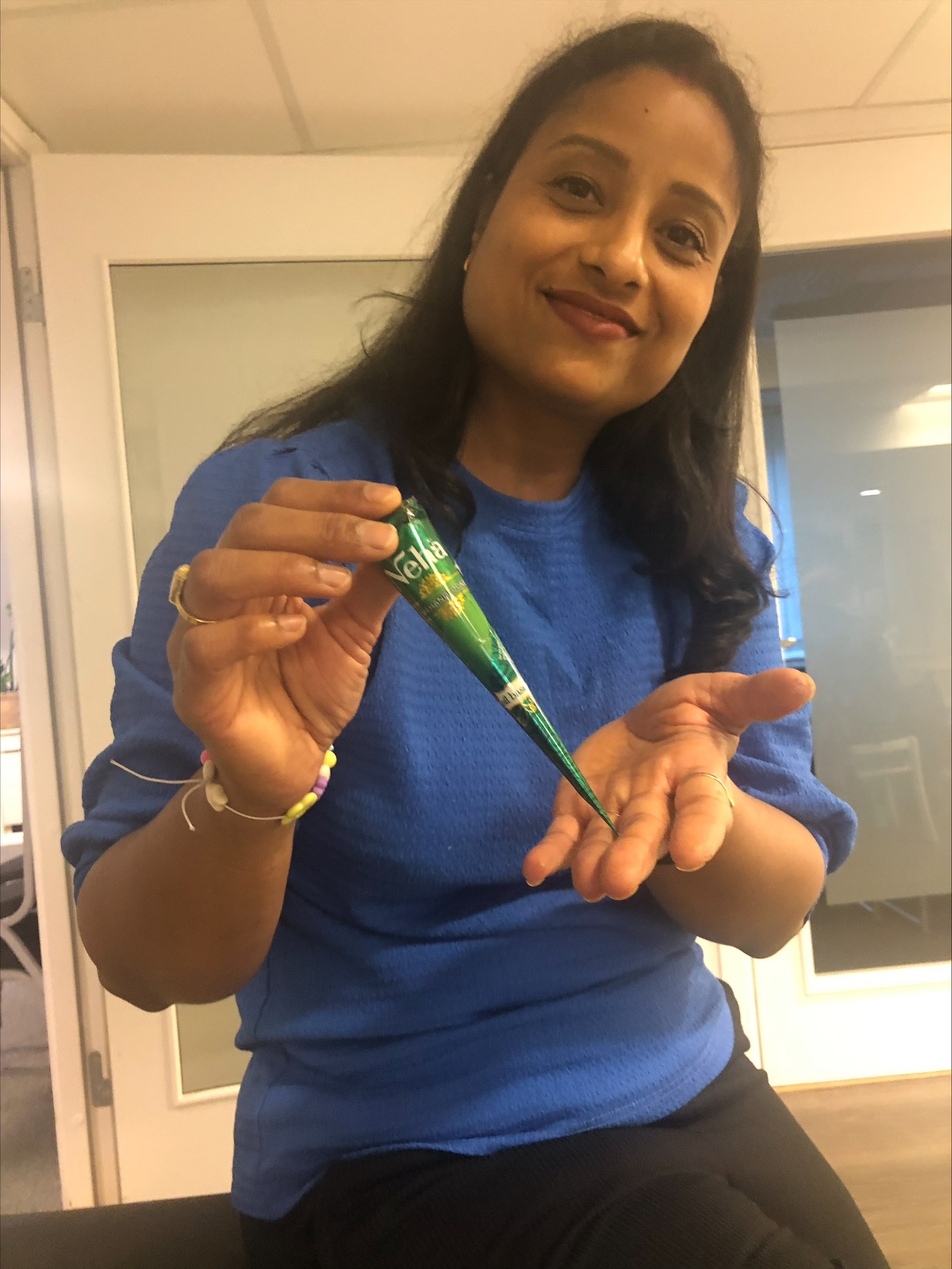 Jag träffar hennaexperten Jyotsana Tripathi i lobbyn på Medborgarskolans femte våning och hon berättar att det hela började som en hobby 2023. Hon ingick i en indisk förening och istället för att ägna sig åt flower art eller högtiden Rangoli, genom att sprida färg på marken, föreslog hon henna som ett enklare alternativ och så blev det.